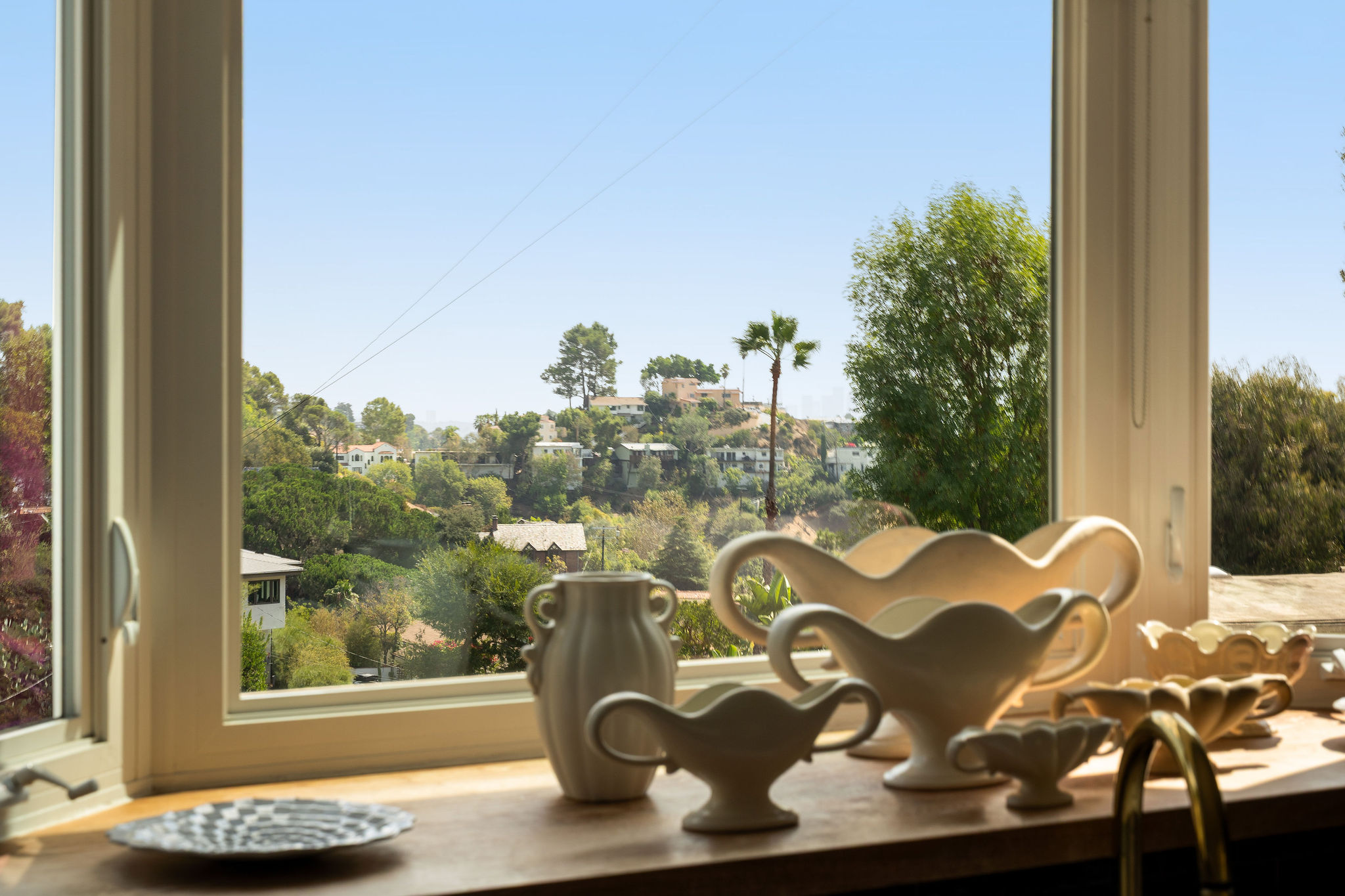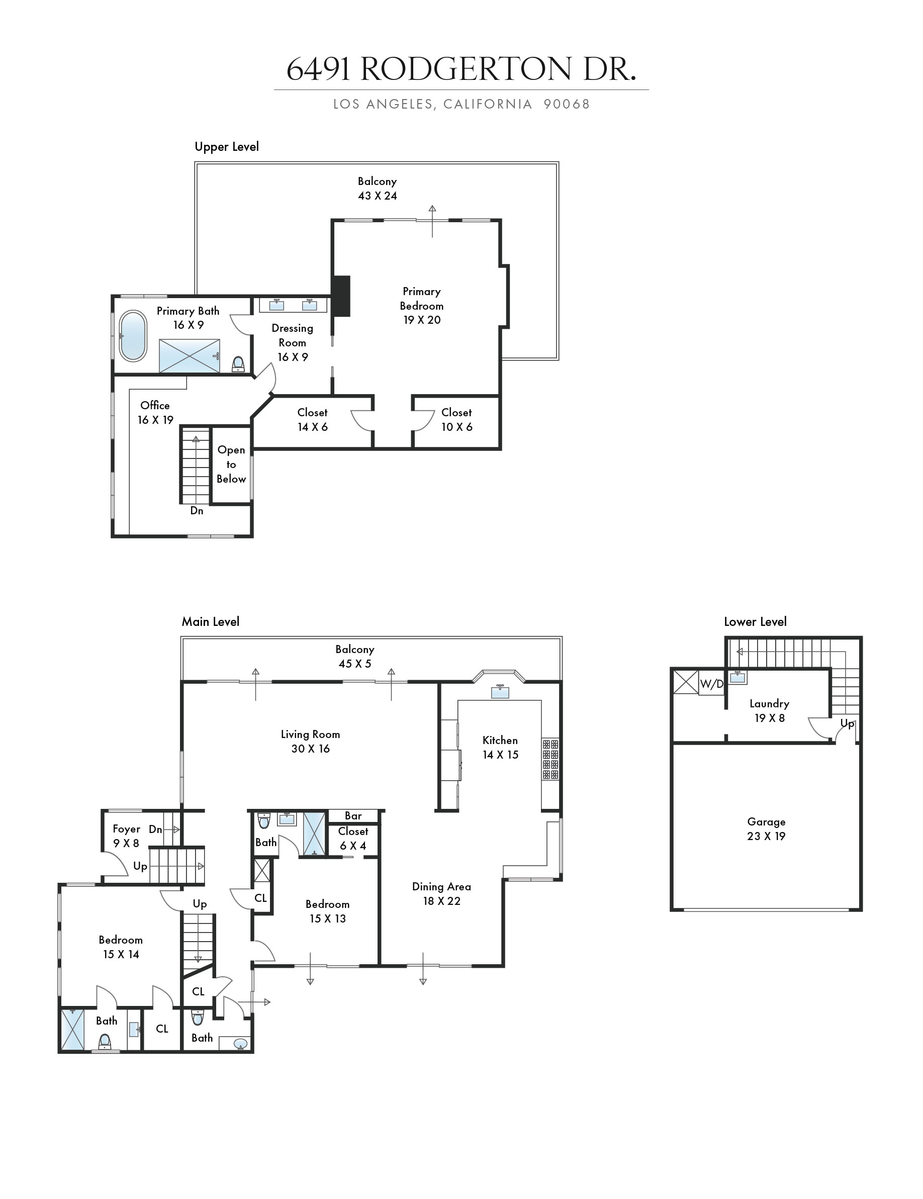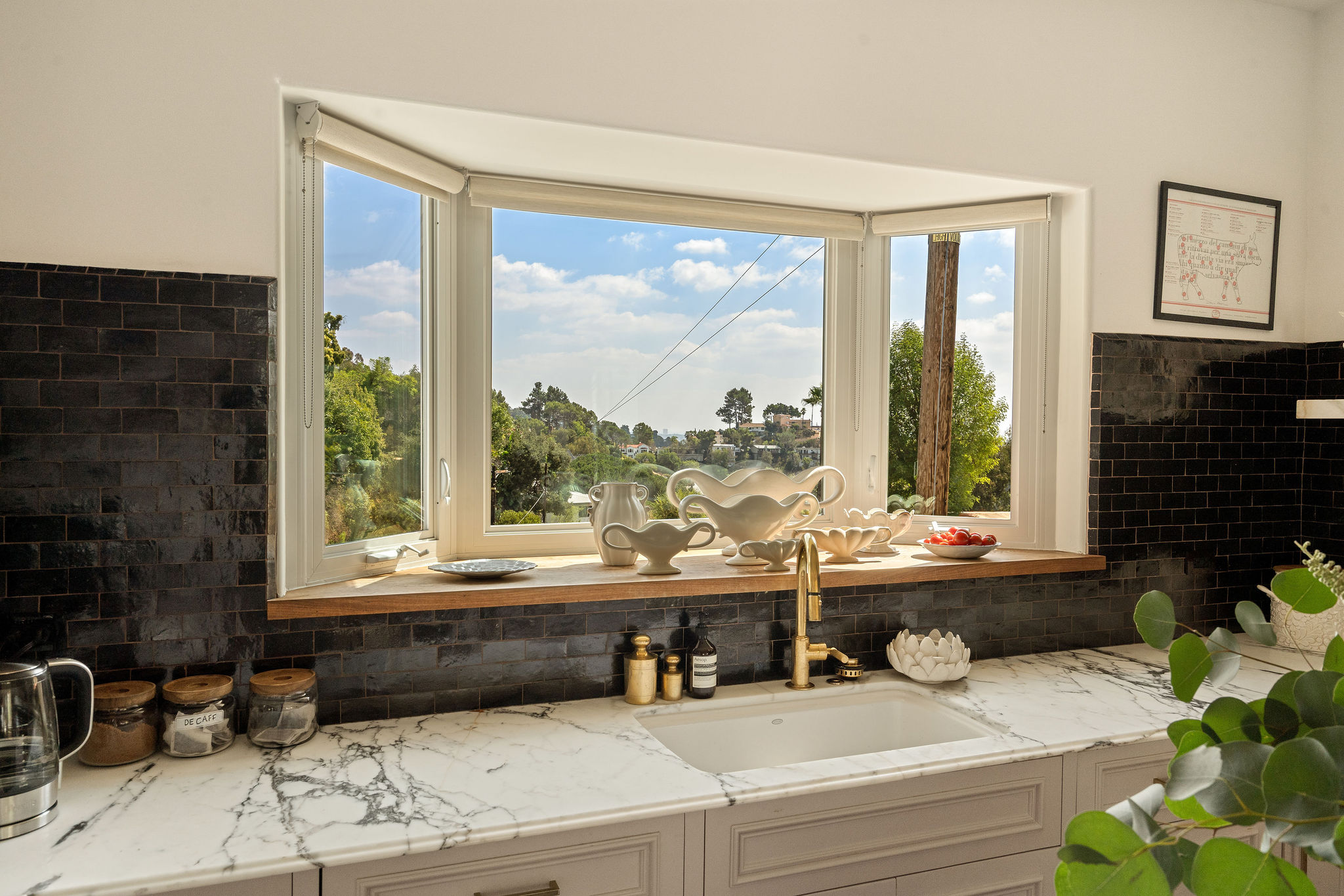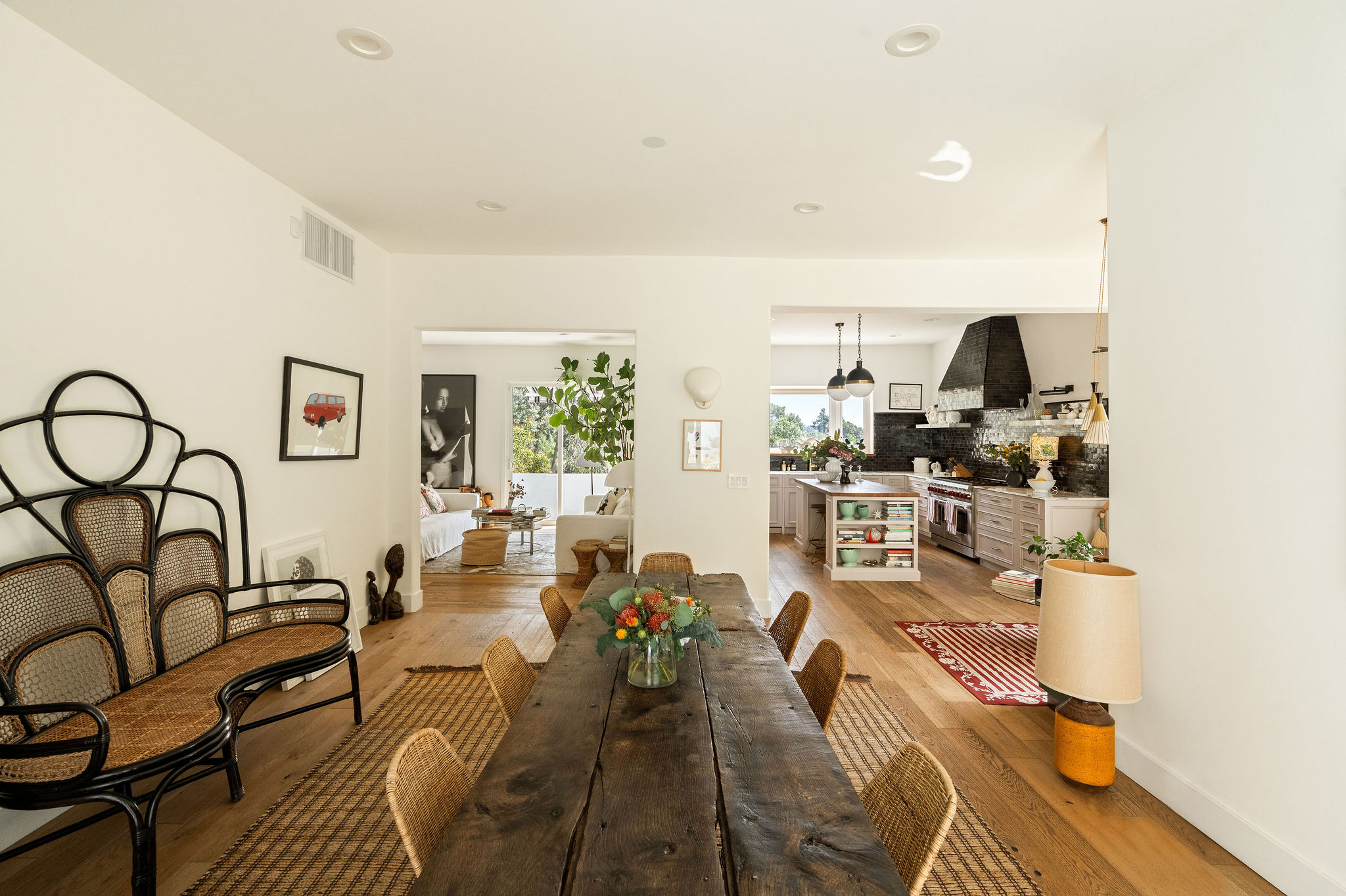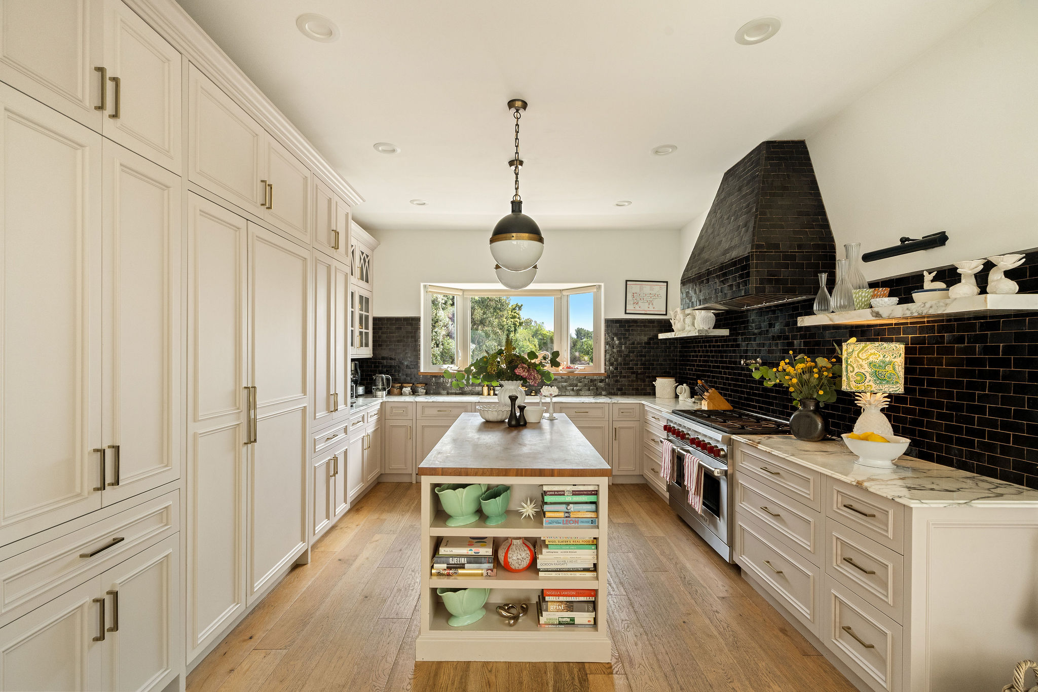 Perched above the Hollywood Reservoir, this house is an art lover’s dream come true, drenched in natural light with soaring ceilings, hardwood floors, gallery-style walls, and designer light fixtures throughout. The main floor is where the entertaining magic happens, with a huge living room that opens to a wrap-around porch, built-in bar, dining room that opens to the backyard with patio and heated pool, and a gorgeous chef’s kitchen with top-of-the line appliances, marble countertops, black Zelig tiled backsplash, Farrow and Ball painted cabinets, and a lovely built-in seating area. The main floor also offers a powder room and two en-suite bedrooms. Upstairs, a practical and stylish library/office leads to the jaw-dropping primary suite, which features dual closets, an incredible bathroom with dual sinks, soaking tub, and steam shower, and a second wrap-around porch offering sweeping views of the hills and Downtown LA skyline. The outdoor space not only includes the pool and multiple patios, there is also a Provence-inspired garden with charming pathways dotted with citrus trees and herbs. So much to love inside and out and a great location close to Beachwood Village and scenic hiking trails, this home offers the dream Beachwood Canyon lifestyle.