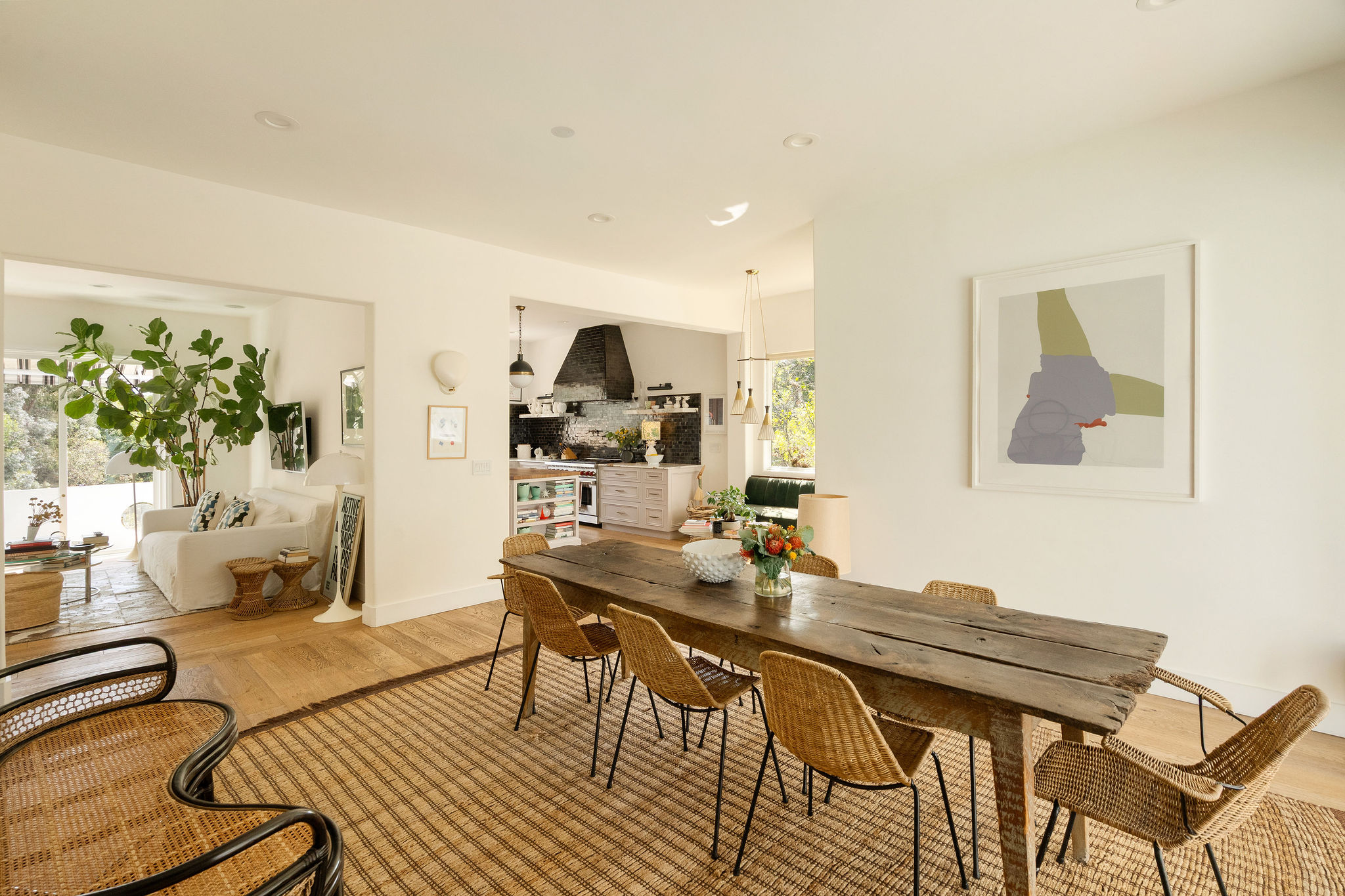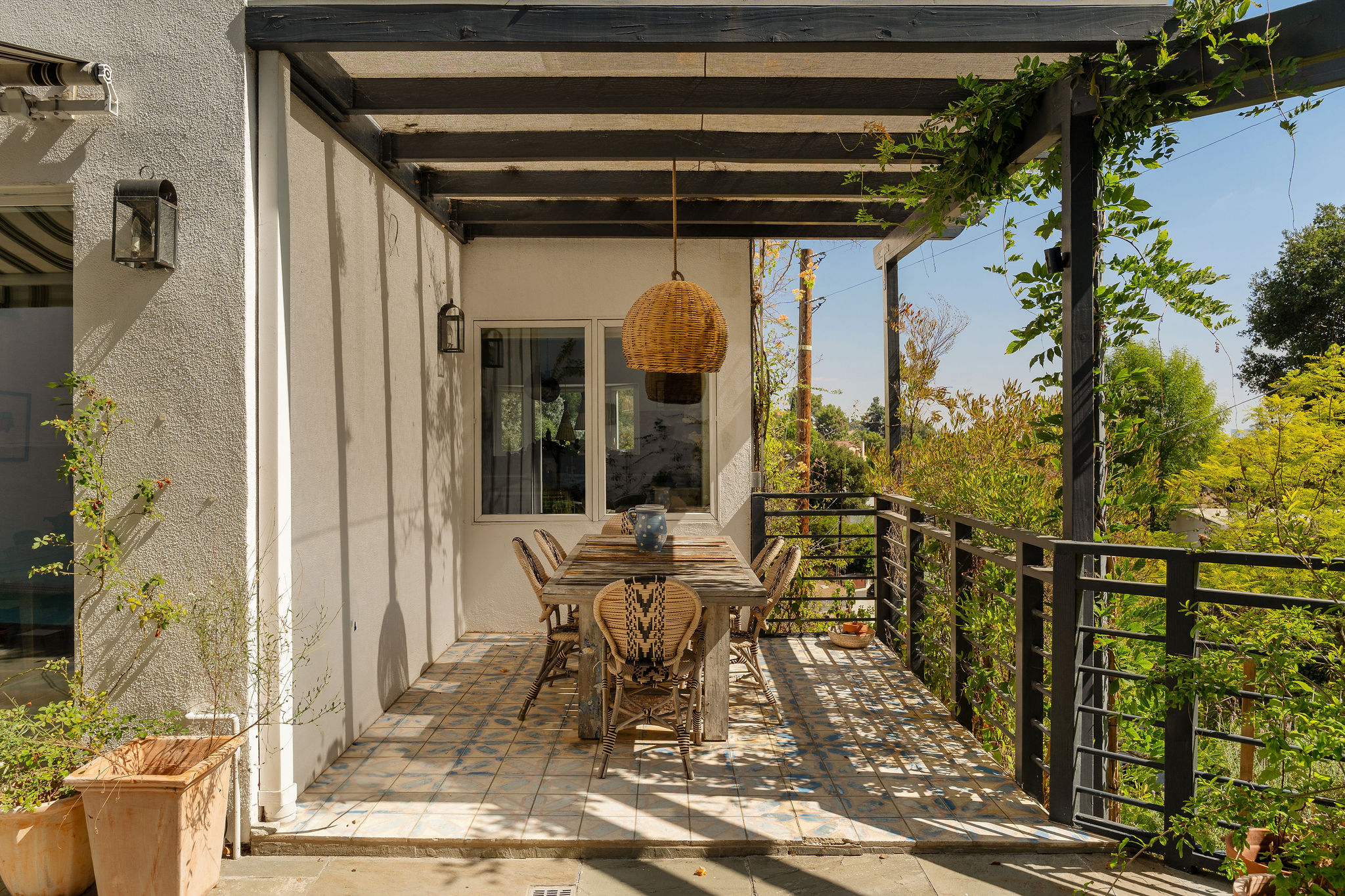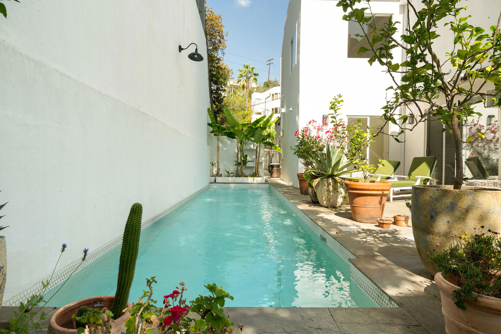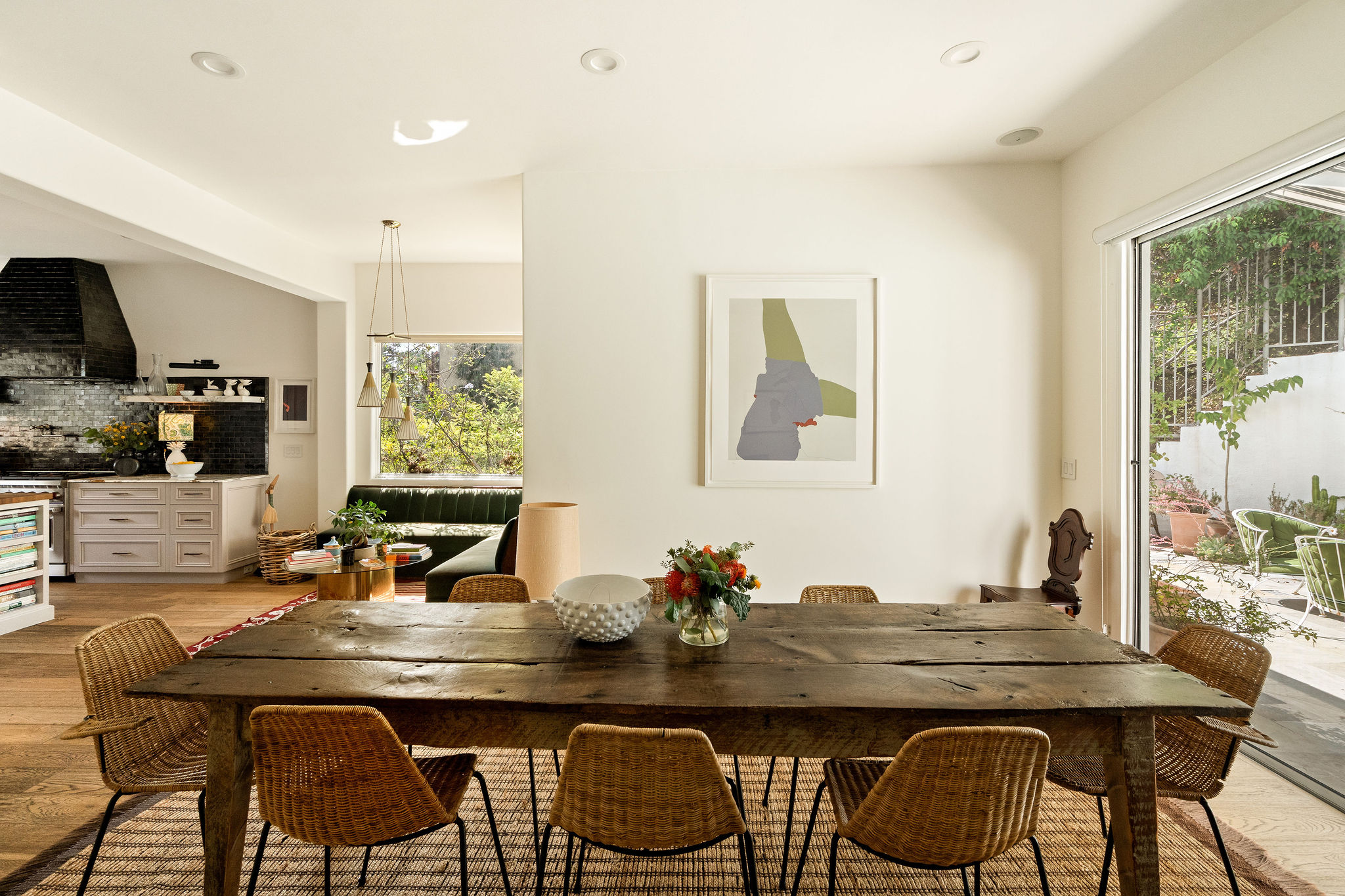 Perched above the Hollywood Reservoir, this house is an art lover’s dream come true, drenched in natural light with soaring ceilings, hardwood floors, gallery-style walls, and designer light fixtures throughout. The main floor is where the entertaining magic happens, with a huge living room that opens to a wrap-around porch, built-in bar, dining room that opens to the backyard with patio and heated pool, and a gorgeous chef’s kitchen with top-of-the line appliances, marble countertops, black Zelig tiled backsplash, Farrow and Ball painted cabinets, and a lovely built-in seating area. The main floor also offers a powder room and two en-suite bedrooms. Upstairs, a practical and stylish library/office leads to the jaw-dropping primary suite, which features dual closets, an incredible bathroom with dual sinks, soaking tub, and steam shower, and a second wrap-around porch offering sweeping views of the hills and Downtown LA skyline. The outdoor space not only includes the pool and multiple patios, there is also a Provence-inspired garden with charming pathways dotted with citrus trees and herbs. So much to love inside and out and a great location close to Beachwood Village and scenic hiking trails, this home offers the dream Beachwood Canyon lifestyle.