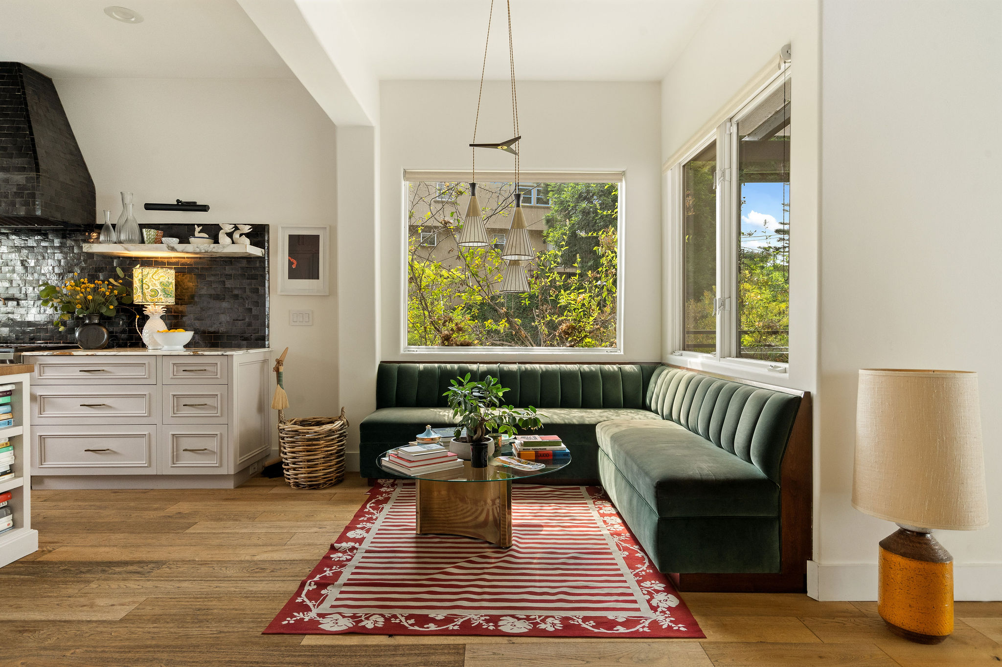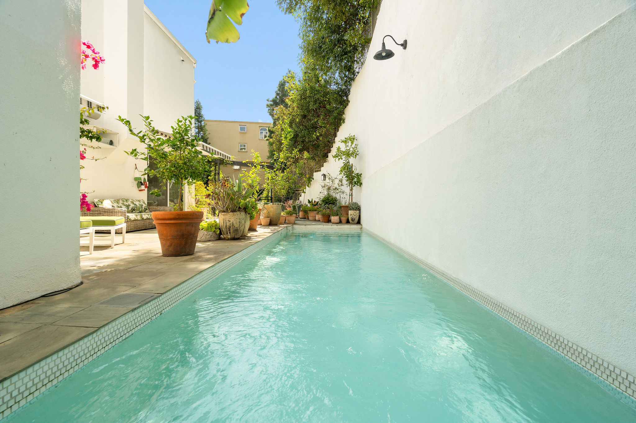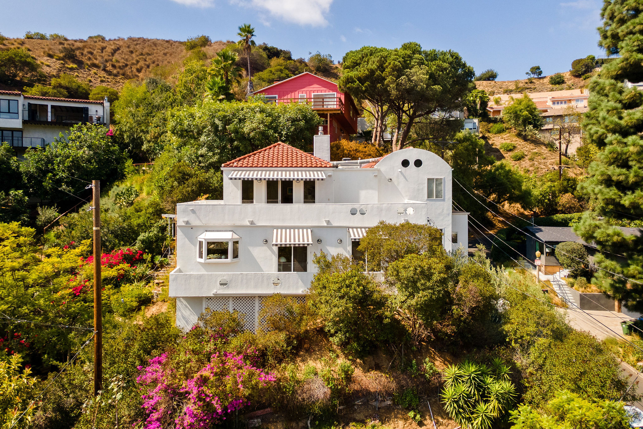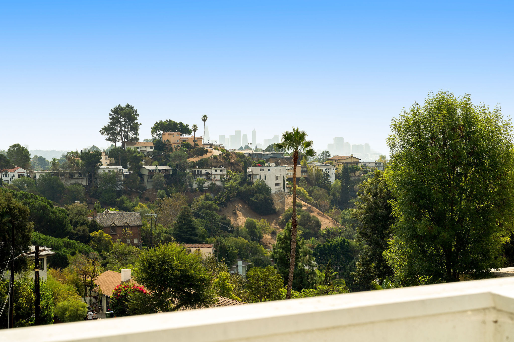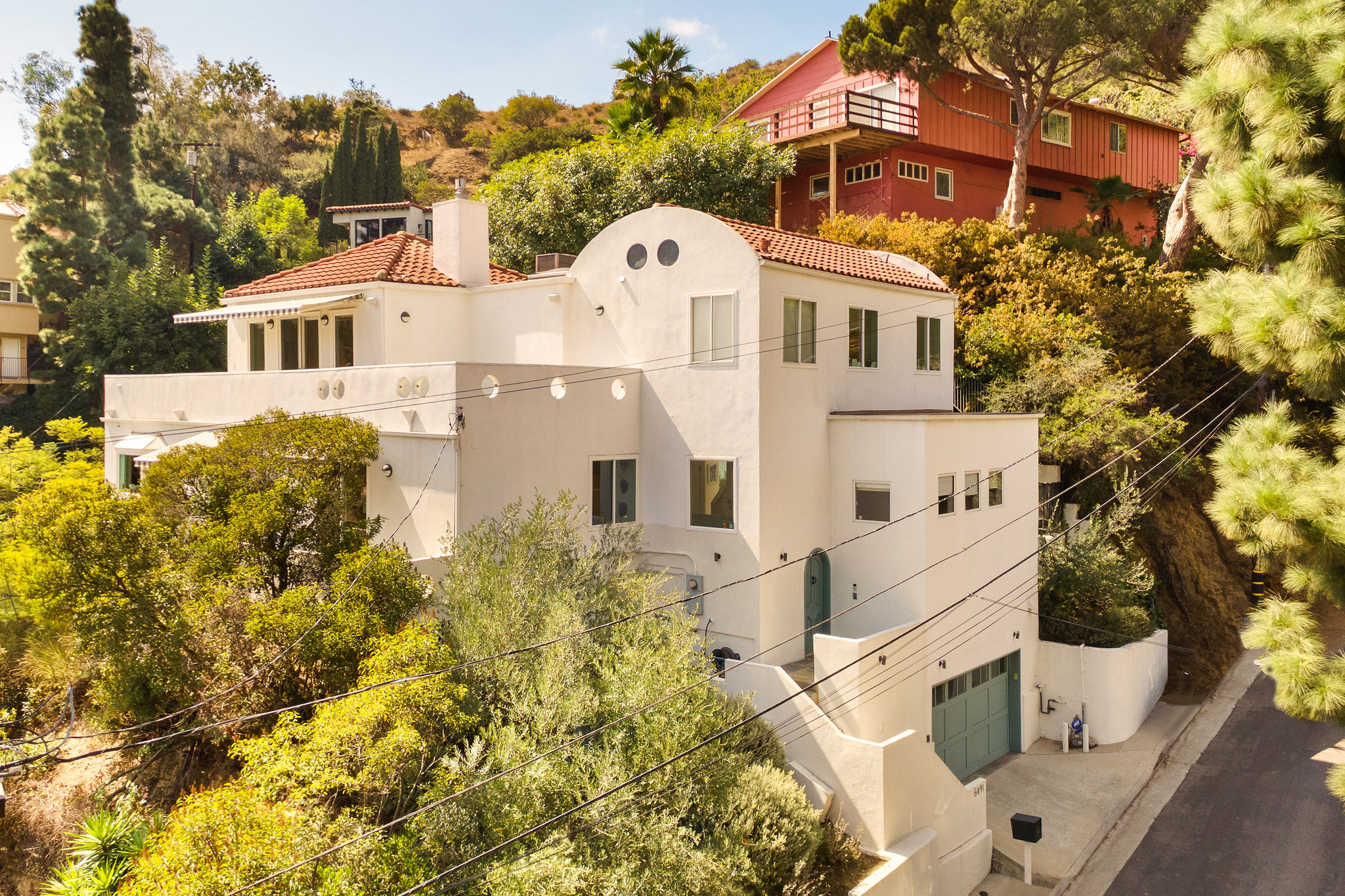 Perched above the Hollywood Reservoir, this house is an art lover’s dream come true, drenched in natural light with soaring ceilings, hardwood floors, gallery-style walls, and designer light fixtures throughout. The main floor is where the entertaining magic happens, with a huge living room that opens to a wrap-around porch, built-in bar, dining room that opens to the backyard with patio and heated pool, and a gorgeous chef’s kitchen with top-of-the line appliances, marble countertops, black Zelig tiled backsplash, Farrow and Ball painted cabinets, and a lovely built-in seating area. The main floor also offers a powder room and two en-suite bedrooms. Upstairs, a practical and stylish library/office leads to the jaw-dropping primary suite, which features dual closets, an incredible bathroom with dual sinks, soaking tub, and steam shower, and a second wrap-around porch offering sweeping views of the hills and Downtown LA skyline. The outdoor space not only includes the pool and multiple patios, there is also a Provence-inspired garden with charming pathways dotted with citrus trees and herbs. So much to love inside and out and a great location close to Beachwood Village and scenic hiking trails, this home offers the dream Beachwood Canyon lifestyle.