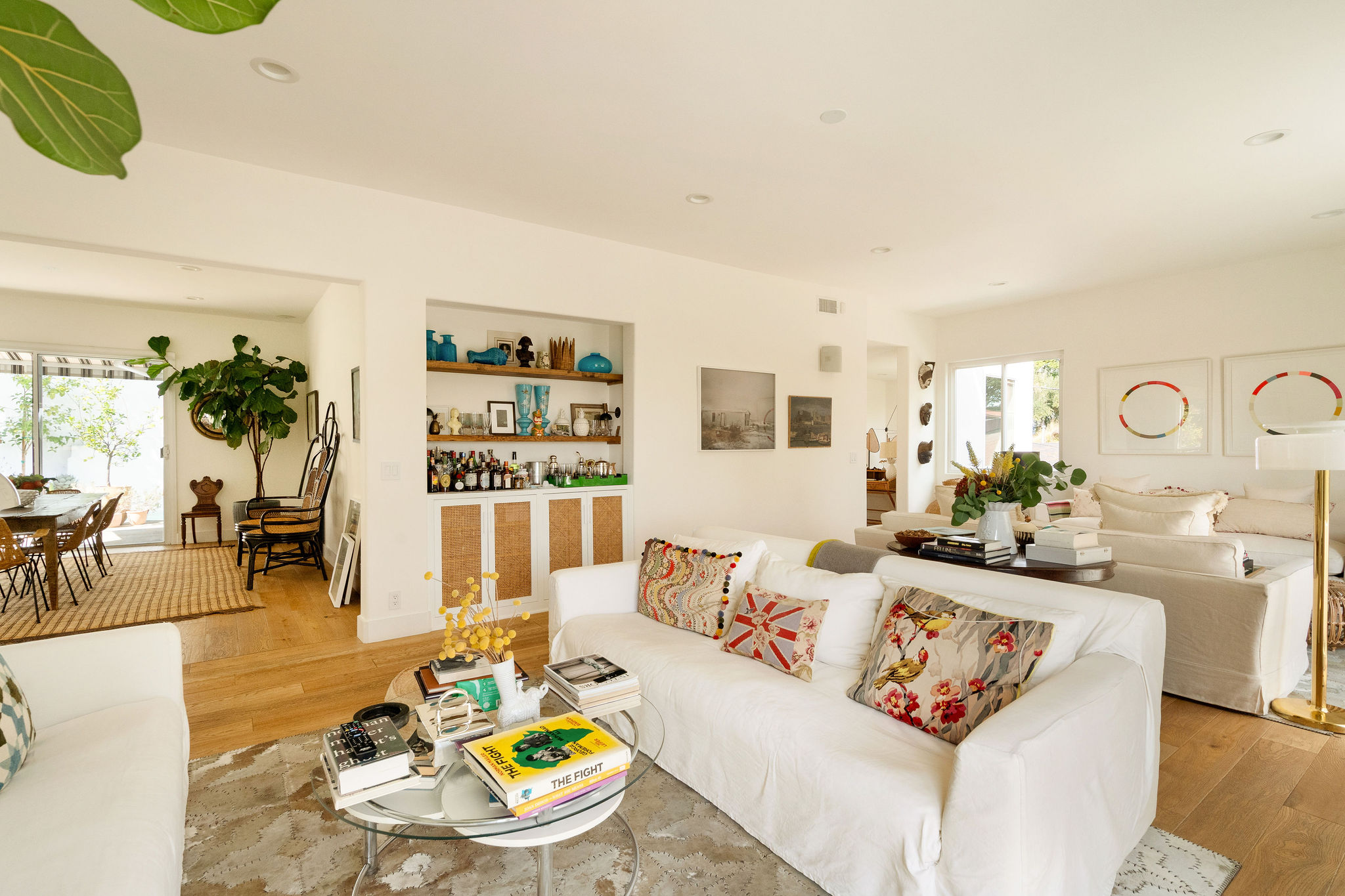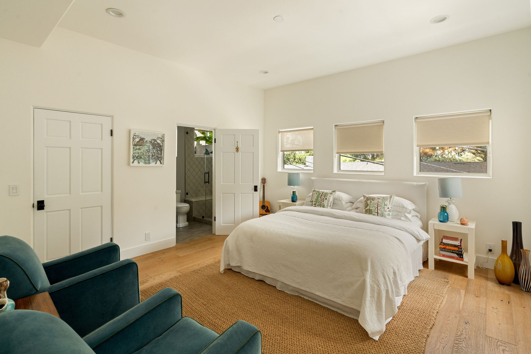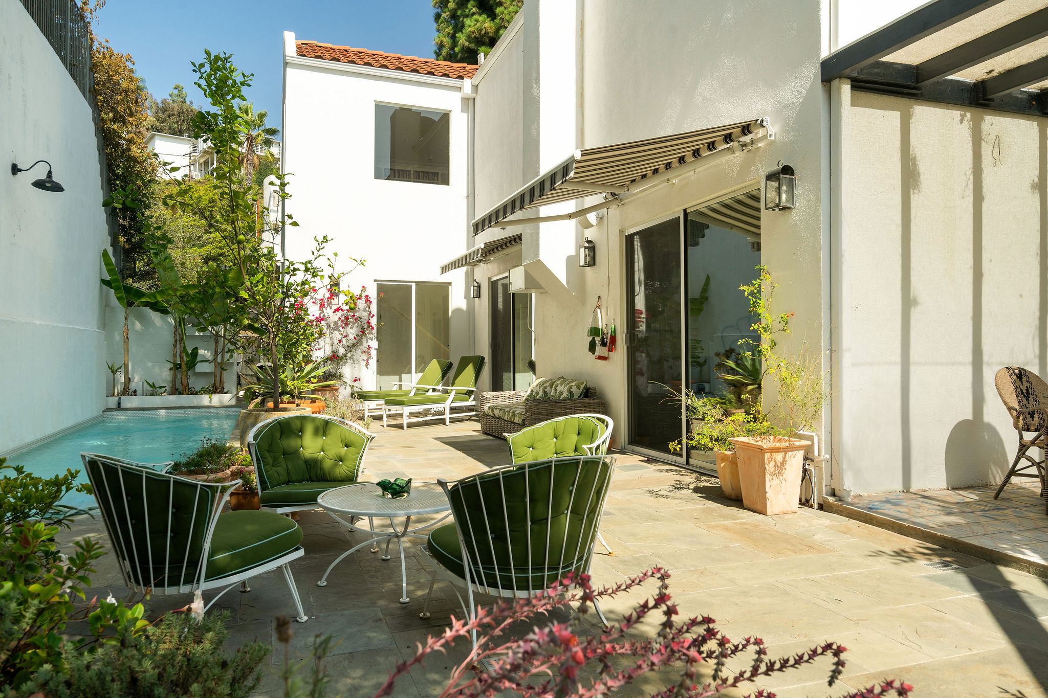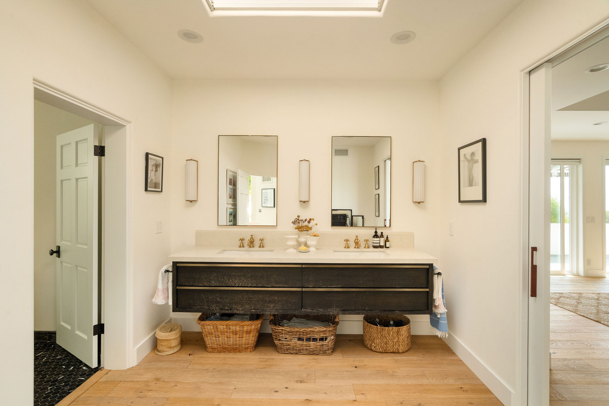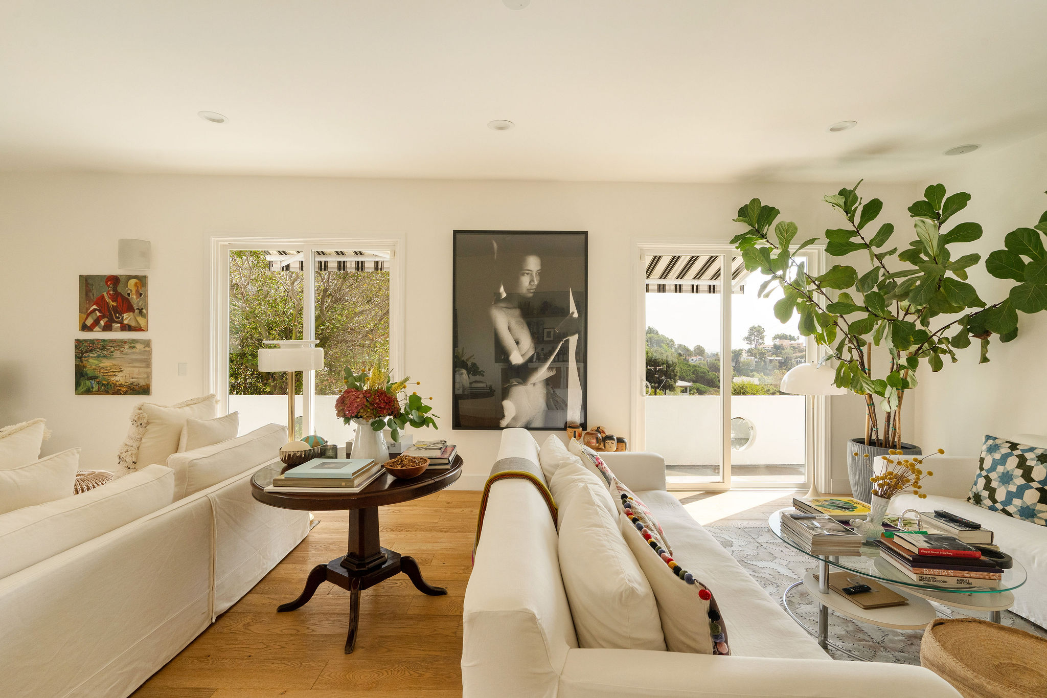 Perched above the Hollywood Reservoir, this house is an art lover’s dream come true, drenched in natural light with soaring ceilings, hardwood floors, gallery-style walls, and designer light fixtures throughout. The main floor is where the entertaining magic happens, with a huge living room that opens to a wrap-around porch, built-in bar, dining room that opens to the backyard with patio and heated pool, and a gorgeous chef’s kitchen with top-of-the line appliances, marble countertops, black Zelig tiled backsplash, Farrow and Ball painted cabinets, and a lovely built-in seating area. The main floor also offers a powder room and two en-suite bedrooms. Upstairs, a practical and stylish library/office leads to the jaw-dropping primary suite, which features dual closets, an incredible bathroom with dual sinks, soaking tub, and steam shower, and a second wrap-around porch offering sweeping views of the hills and Downtown LA skyline. The outdoor space not only includes the pool and multiple patios, there is also a Provence-inspired garden with charming pathways dotted with citrus trees and herbs. So much to love inside and out and a great location close to Beachwood Village and scenic hiking trails, this home offers the dream Beachwood Canyon lifestyle.