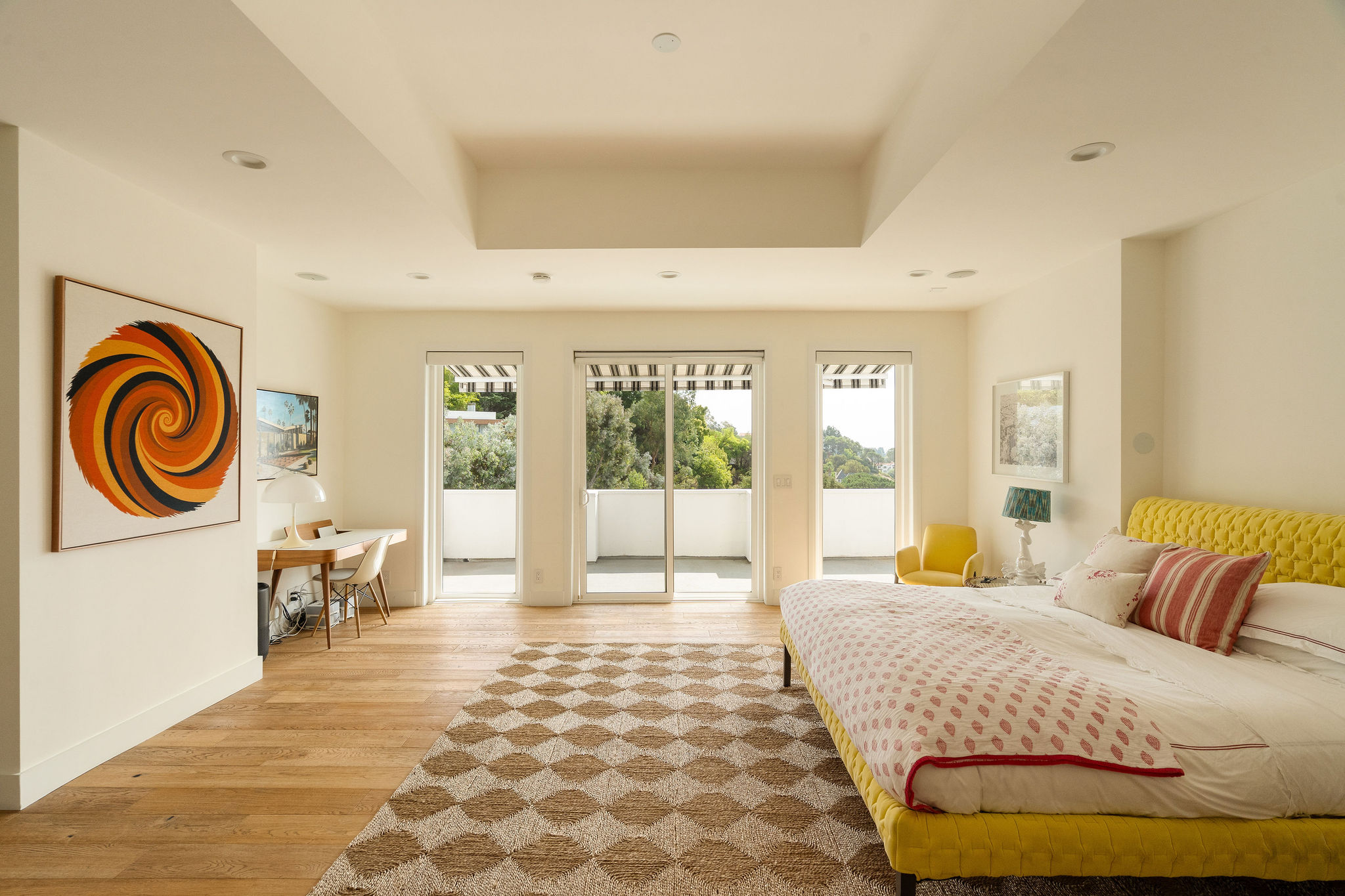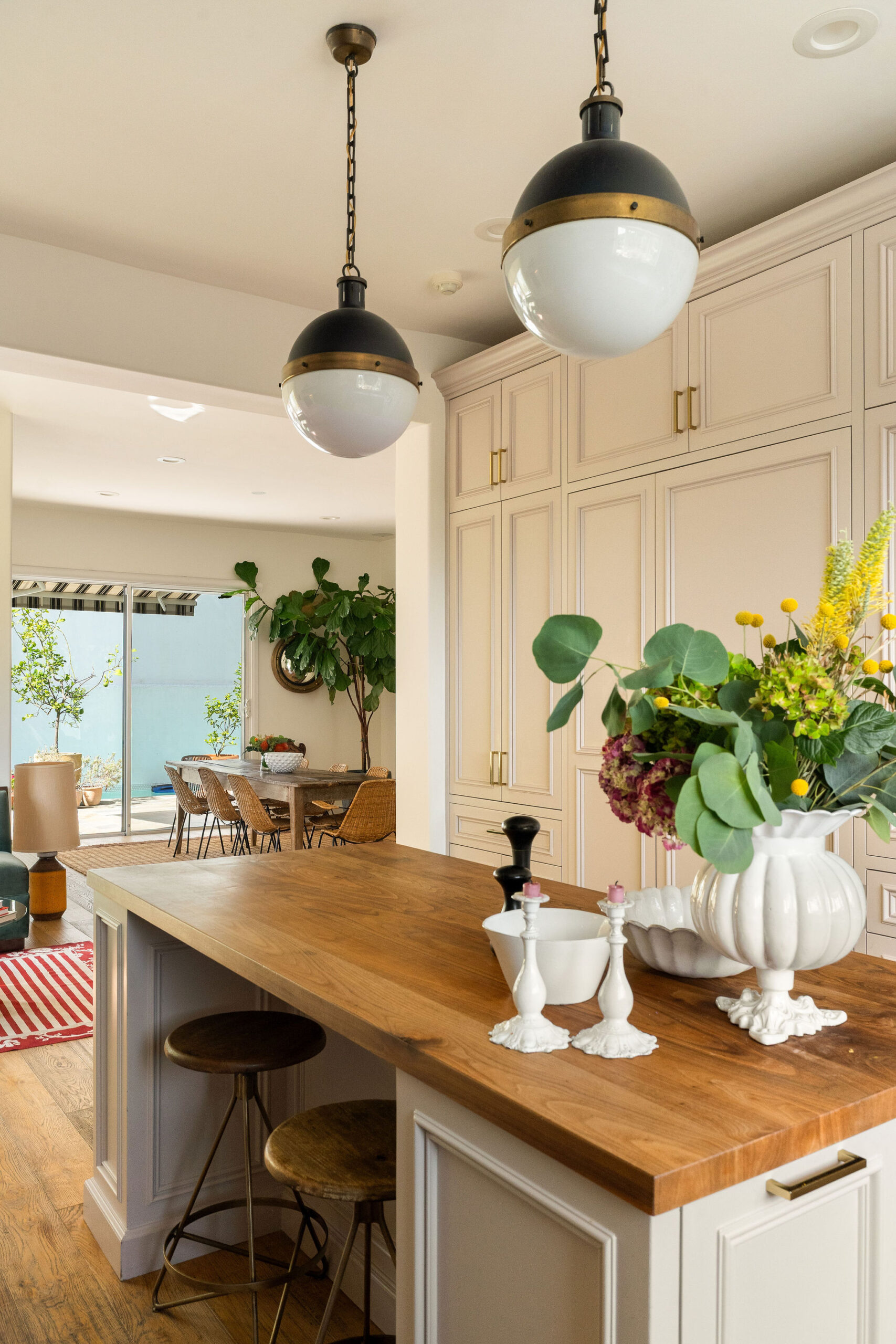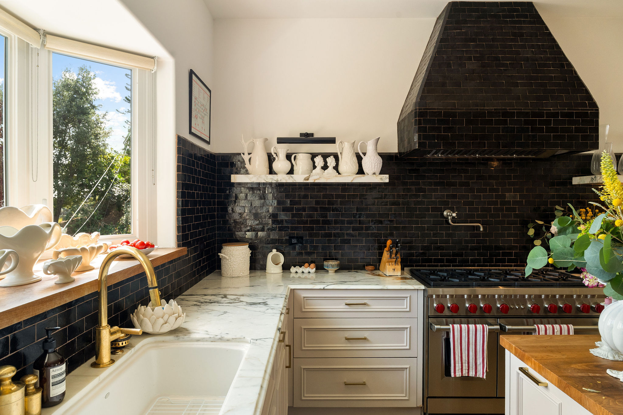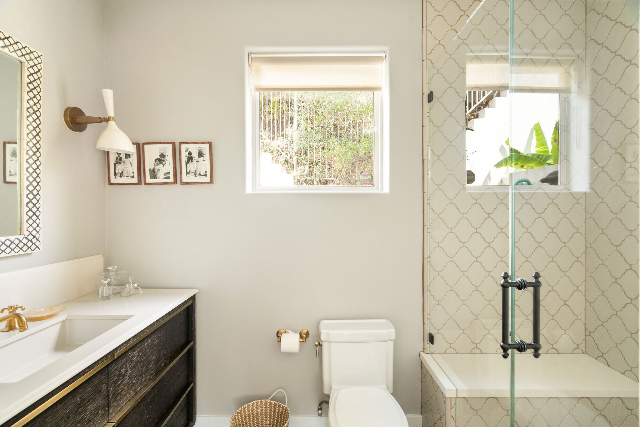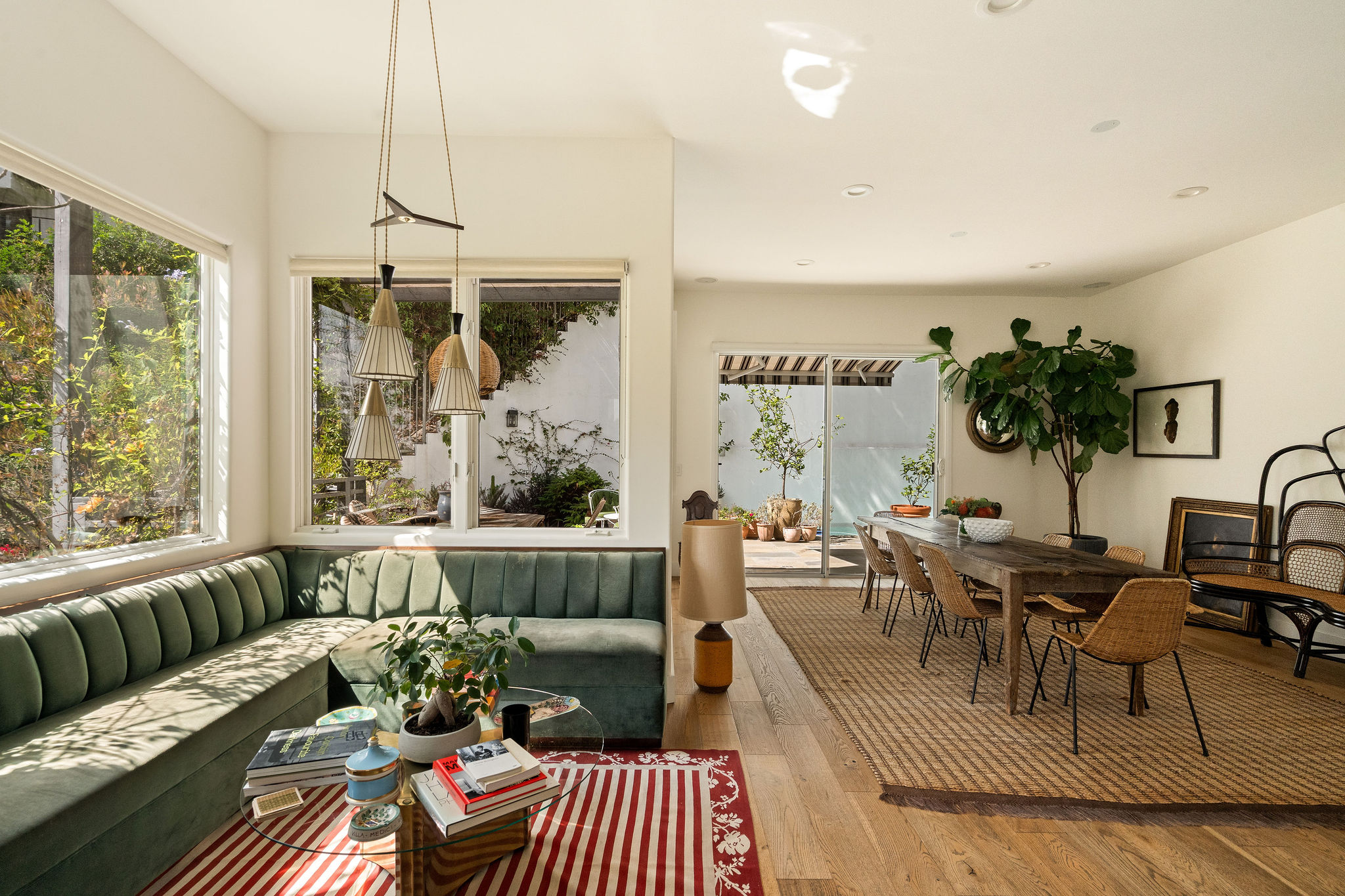 Perched above the Hollywood Reservoir, this house is an art lover’s dream come true, drenched in natural light with soaring ceilings, hardwood floors, gallery-style walls, and designer light fixtures throughout. The main floor is where the entertaining magic happens, with a huge living room that opens to a wrap-around porch, built-in bar, dining room that opens to the backyard with patio and heated pool, and a gorgeous chef’s kitchen with top-of-the line appliances, marble countertops, black Zelig tiled backsplash, Farrow and Ball painted cabinets, and a lovely built-in seating area. The main floor also offers a powder room and two en-suite bedrooms. Upstairs, a practical and stylish library/office leads to the jaw-dropping primary suite, which features dual closets, an incredible bathroom with dual sinks, soaking tub, and steam shower, and a second wrap-around porch offering sweeping views of the hills and Downtown LA skyline. The outdoor space not only includes the pool and multiple patios, there is also a Provence-inspired garden with charming pathways dotted with citrus trees and herbs. So much to love inside and out and a great location close to Beachwood Village and scenic hiking trails, this home offers the dream Beachwood Canyon lifestyle.