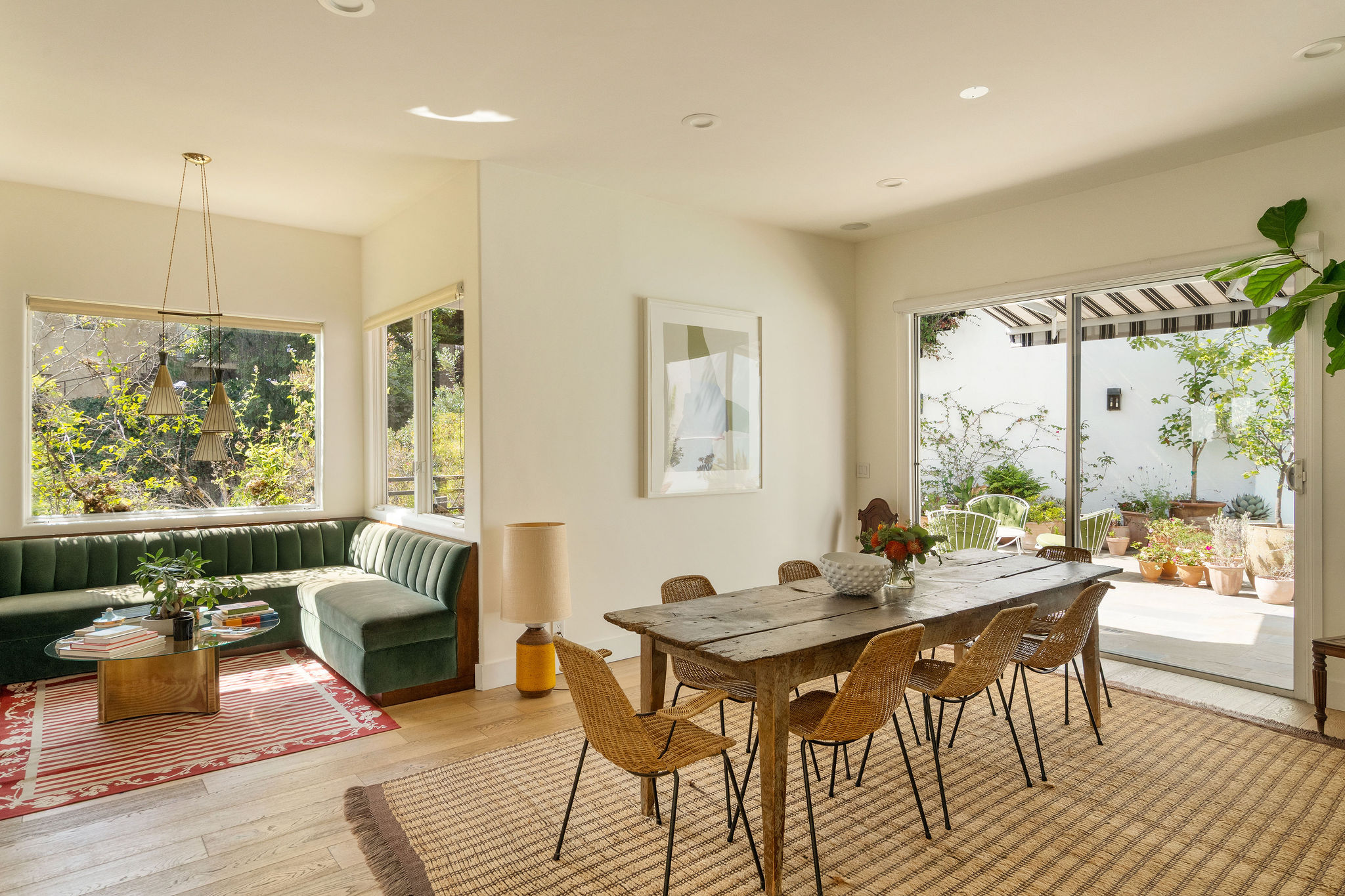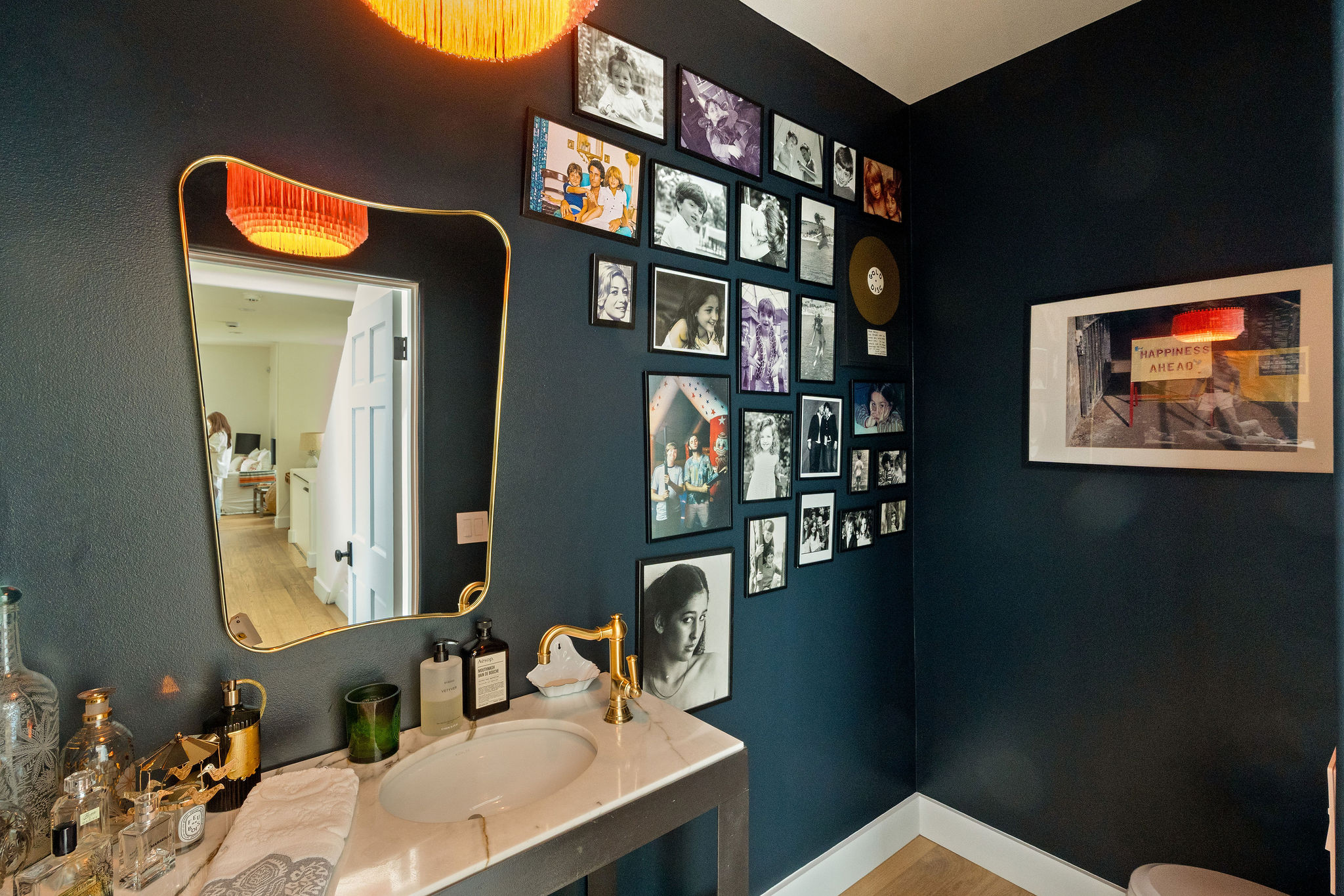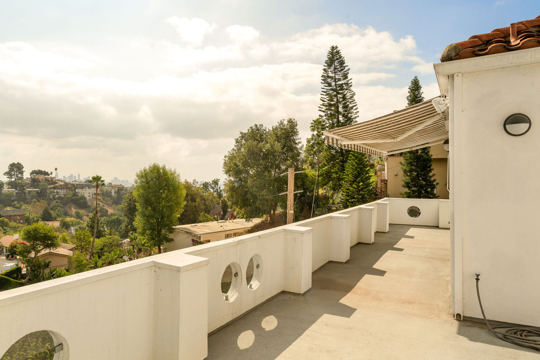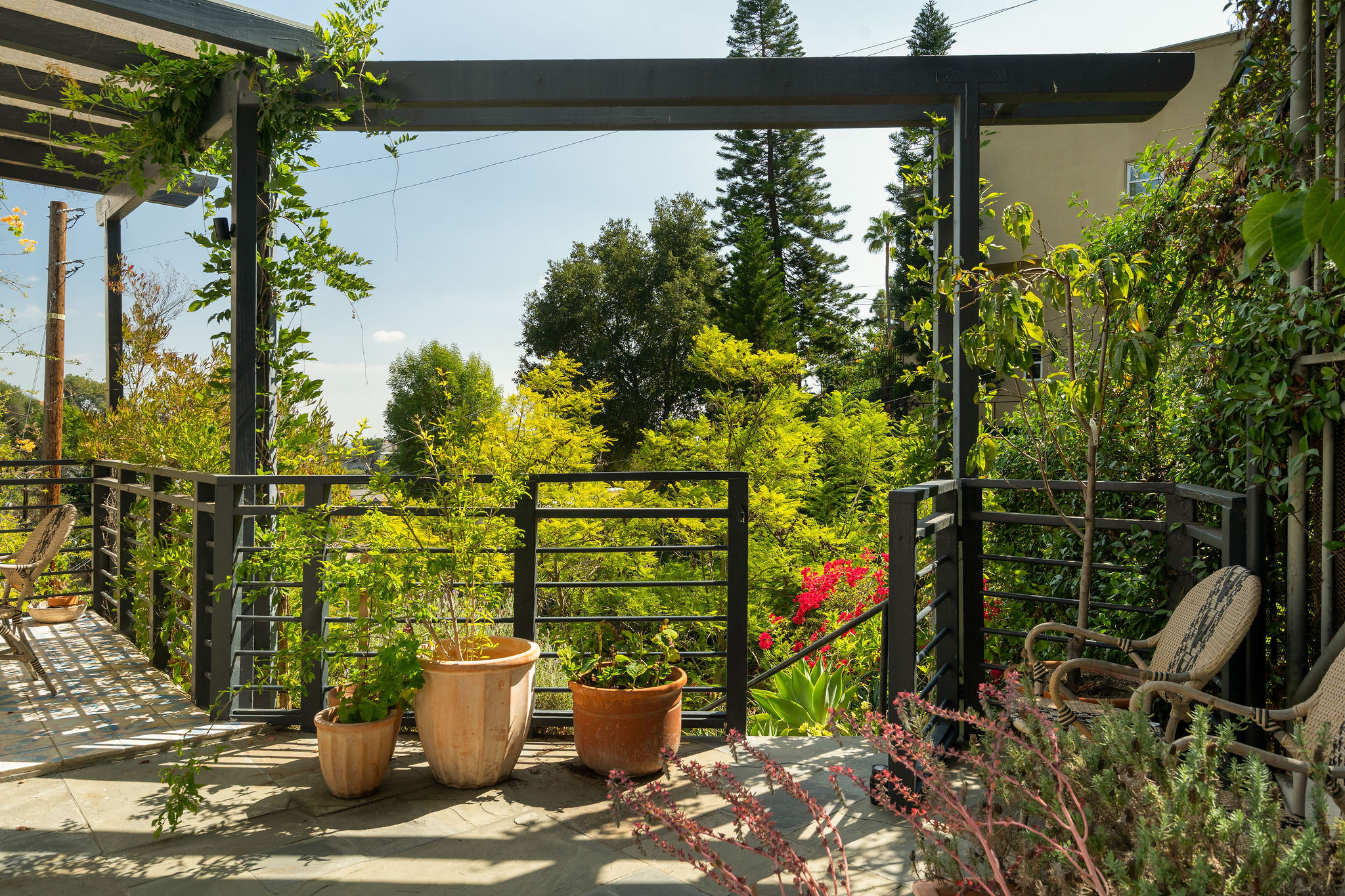 Perched above the Hollywood Reservoir, this house is an art lover’s dream come true, drenched in natural light with soaring ceilings, hardwood floors, gallery-style walls, and designer light fixtures throughout. The main floor is where the entertaining magic happens, with a huge living room that opens to a wrap-around porch, built-in bar, dining room that opens to the backyard with patio and heated pool, and a gorgeous chef’s kitchen with top-of-the line appliances, marble countertops, black Zelig tiled backsplash, Farrow and Ball painted cabinets, and a lovely built-in seating area. The main floor also offers a powder room and two en-suite bedrooms. Upstairs, a practical and stylish library/office leads to the jaw-dropping primary suite, which features dual closets, an incredible bathroom with dual sinks, soaking tub, and steam shower, and a second wrap-around porch offering sweeping views of the hills and Downtown LA skyline. The outdoor space not only includes the pool and multiple patios, there is also a Provence-inspired garden with charming pathways dotted with citrus trees and herbs. So much to love inside and out and a great location close to Beachwood Village and scenic hiking trails, this home offers the dream Beachwood Canyon lifestyle.