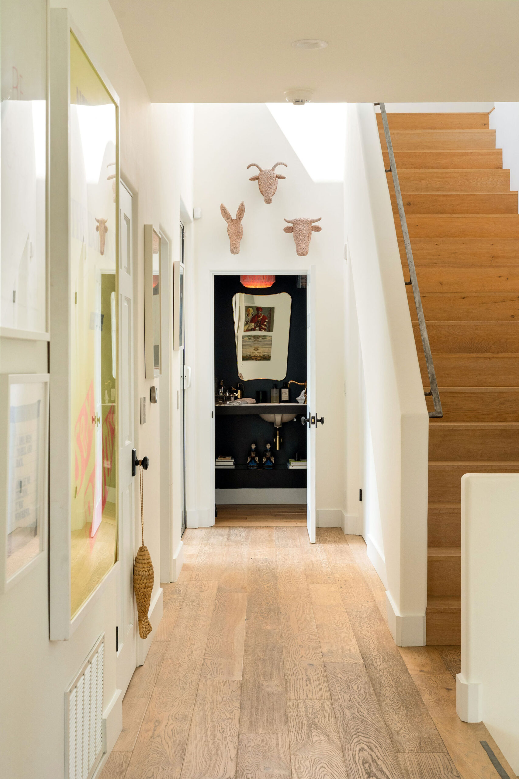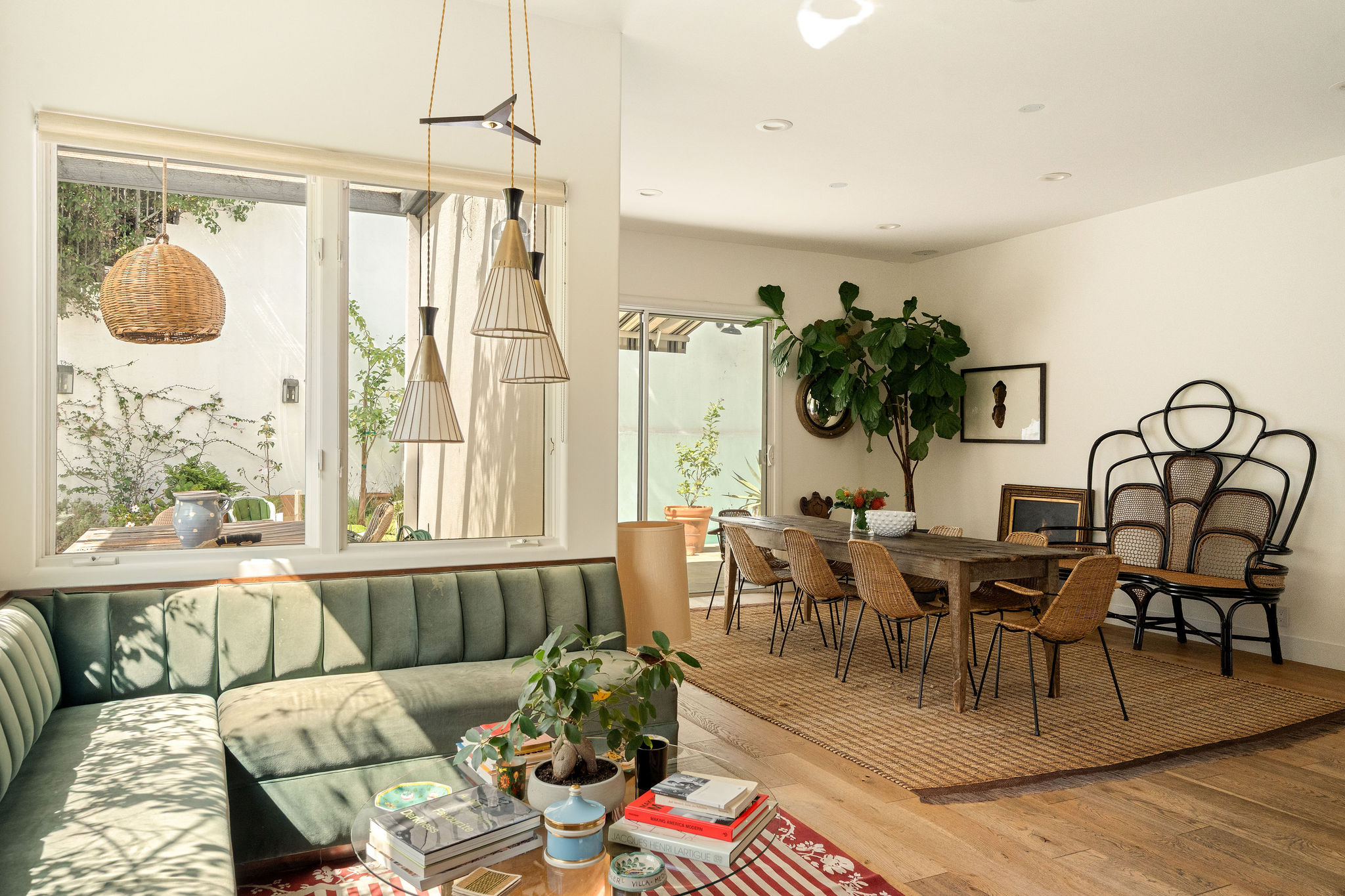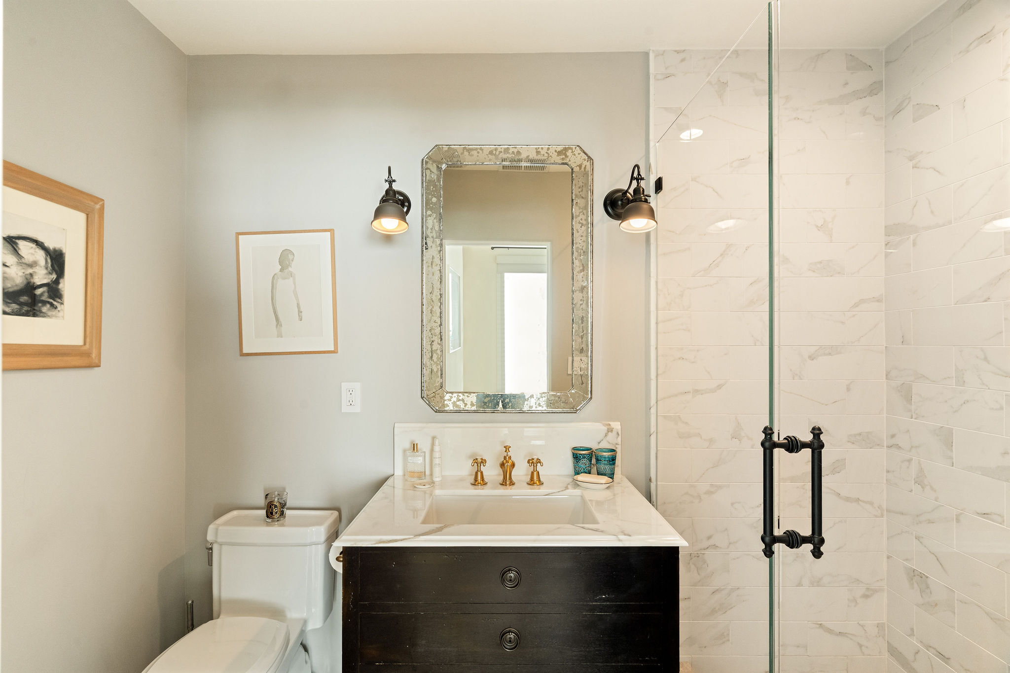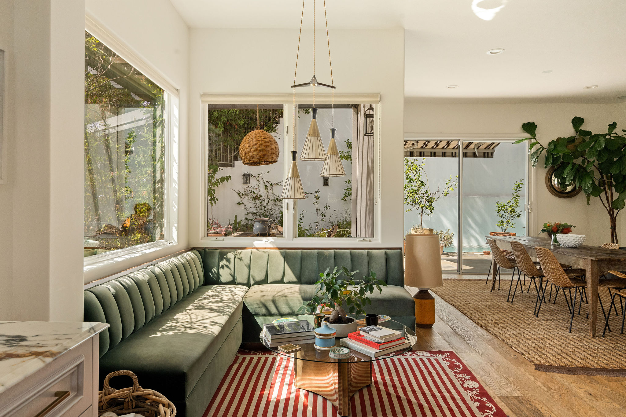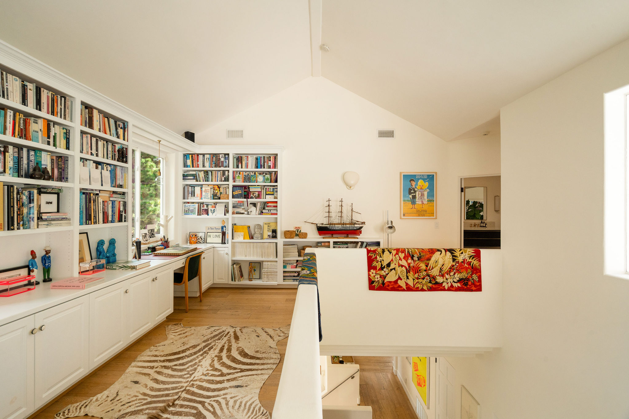 Perched above the Hollywood Reservoir, this house is an art lover’s dream come true, drenched in natural light with soaring ceilings, hardwood floors, gallery-style walls, and designer light fixtures throughout. The main floor is where the entertaining magic happens, with a huge living room that opens to a wrap-around porch, built-in bar, dining room that opens to the backyard with patio and heated pool, and a gorgeous chef’s kitchen with top-of-the line appliances, marble countertops, black Zelig tiled backsplash, Farrow and Ball painted cabinets, and a lovely built-in seating area. The main floor also offers a powder room and two en-suite bedrooms. Upstairs, a practical and stylish library/office leads to the jaw-dropping primary suite, which features dual closets, an incredible bathroom with dual sinks, soaking tub, and steam shower, and a second wrap-around porch offering sweeping views of the hills and Downtown LA skyline. The outdoor space not only includes the pool and multiple patios, there is also a Provence-inspired garden with charming pathways dotted with citrus trees and herbs. So much to love inside and out and a great location close to Beachwood Village and scenic hiking trails, this home offers the dream Beachwood Canyon lifestyle.