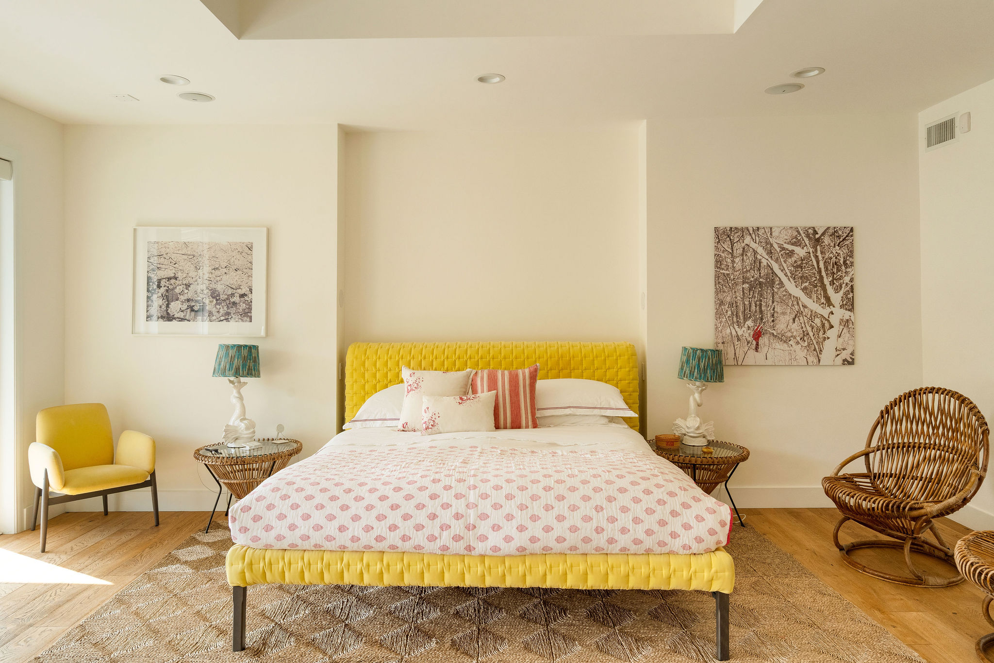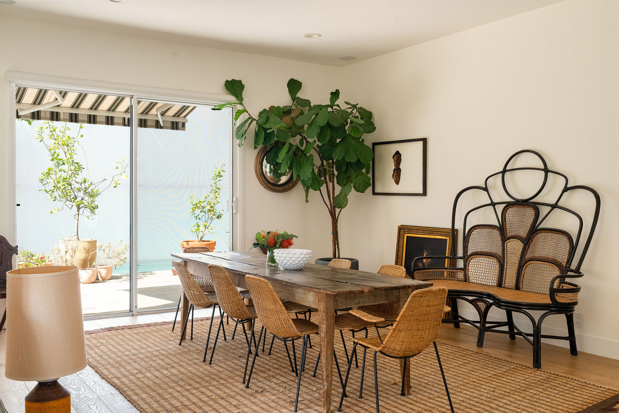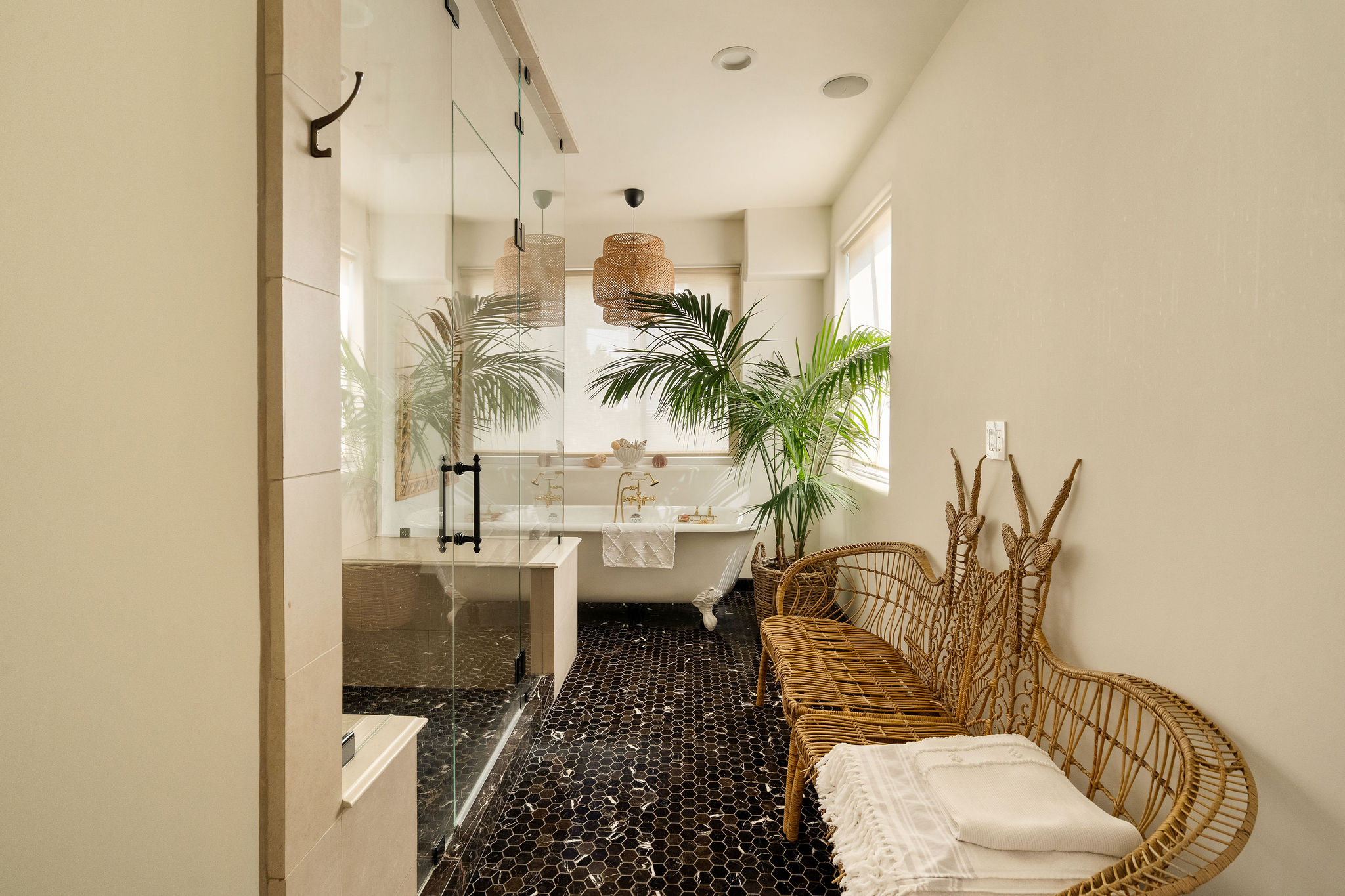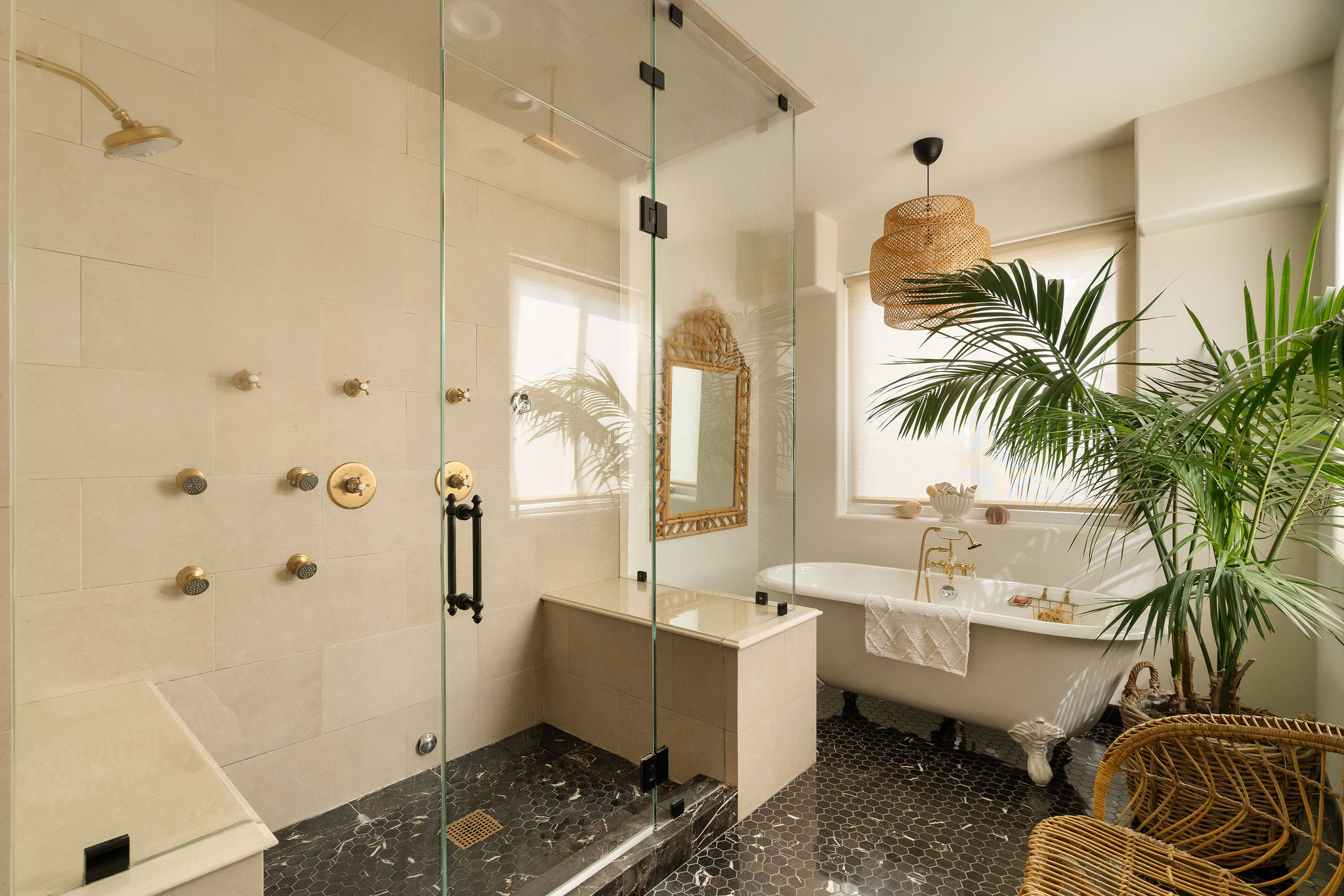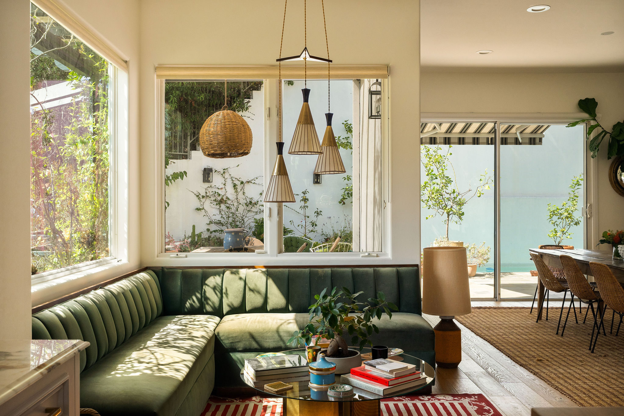 Perched above the Hollywood Reservoir, this house is an art lover’s dream come true, drenched in natural light with soaring ceilings, hardwood floors, gallery-style walls, and designer light fixtures throughout. The main floor is where the entertaining magic happens, with a huge living room that opens to a wrap-around porch, built-in bar, dining room that opens to the backyard with patio and heated pool, and a gorgeous chef’s kitchen with top-of-the line appliances, marble countertops, black Zelig tiled backsplash, Farrow and Ball painted cabinets, and a lovely built-in seating area. The main floor also offers a powder room and two en-suite bedrooms. Upstairs, a practical and stylish library/office leads to the jaw-dropping primary suite, which features dual closets, an incredible bathroom with dual sinks, soaking tub, and steam shower, and a second wrap-around porch offering sweeping views of the hills and Downtown LA skyline. The outdoor space not only includes the pool and multiple patios, there is also a Provence-inspired garden with charming pathways dotted with citrus trees and herbs. So much to love inside and out and a great location close to Beachwood Village and scenic hiking trails, this home offers the dream Beachwood Canyon lifestyle.